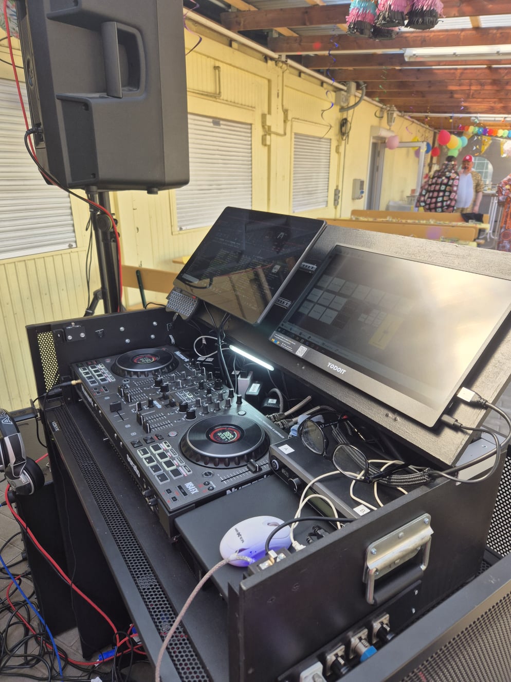 DJ Controller, 2 x 15 Zoll PA-Lautsprecher RCF (1400 Watt) , 2xHK Audio Subwoofer ( 2000 Watt), Komplette Lichtanlage ( Spot Lights, Laser, Strobe uvm… ) Effekt Lichter Ambiente LED Spots Sennheiser Mikrofon.